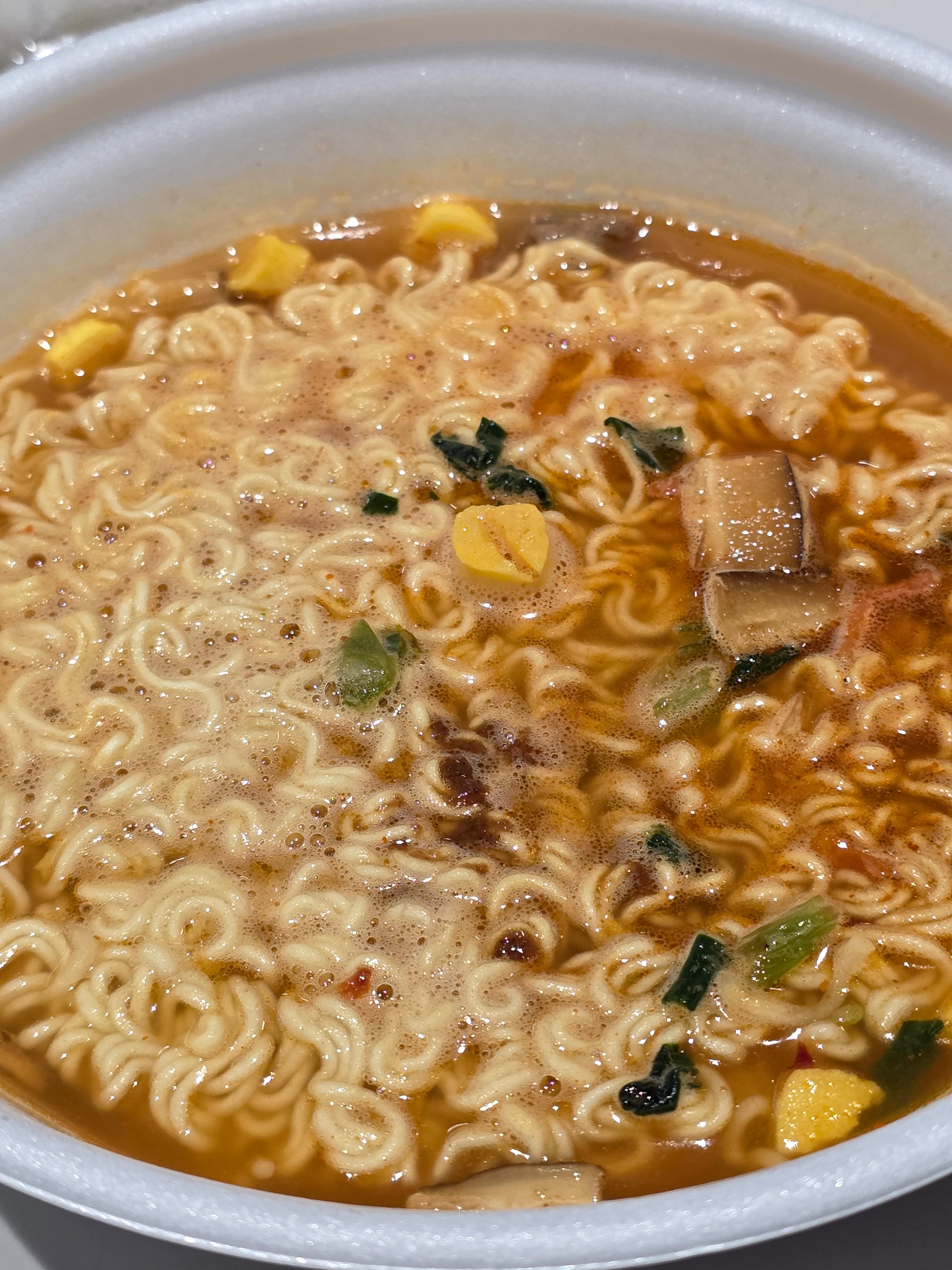 국물 한 숟갈을 뜨자마자 느껴지는 건 정육 베이스의 깊고 진한 맛. 마치 전골 육수를 응축해 놓은 듯한 묵직함이 있습니다. 깔끔한 매운맛과 함께 은은한 감칠맛이 오래 남아, 단순한 자극이 아닌 '고급 국물 요리' 같은 느낌이었습니다. 면발은 기존 컵라면보다 살짝 더 도톰하고, 국물과의 궁합도 좋았습니다. 다만, 고기 건더기의 양이 많지는 않아 실제 고기라기보단 풍미 강조에 집중한 듯 보였습니다.