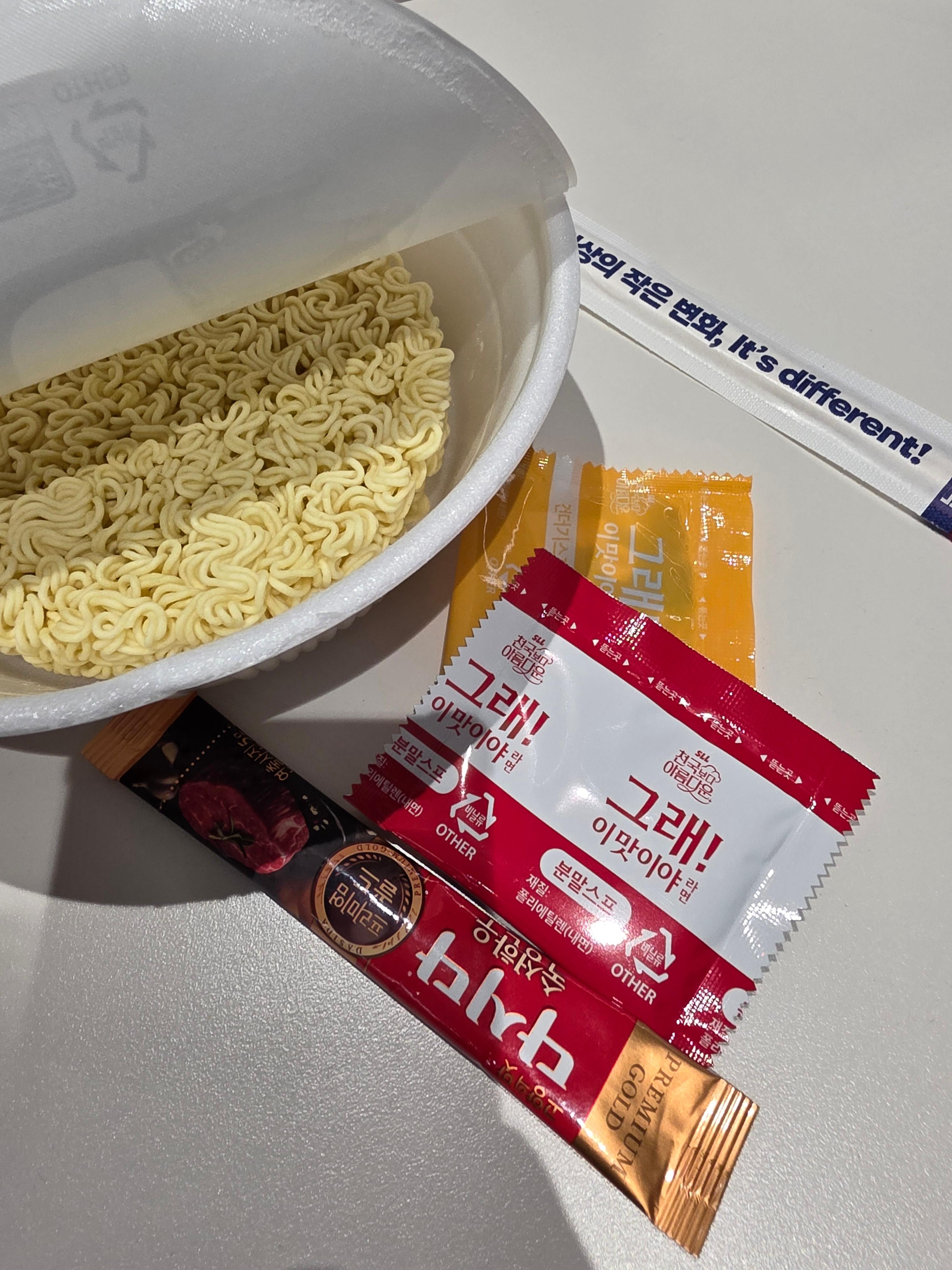조리법은 일반 컵라면과 유사하나, 분말 스프의 농도나 향에서부터 확연한 차이를 느낄 수 있었습니다. 스프 함량 중 30.3%가 다시다 프리미엄 원료로 구성되어 있다고 하니, 그 진한 육수 맛은 예상된 결과일지도 모릅니다.