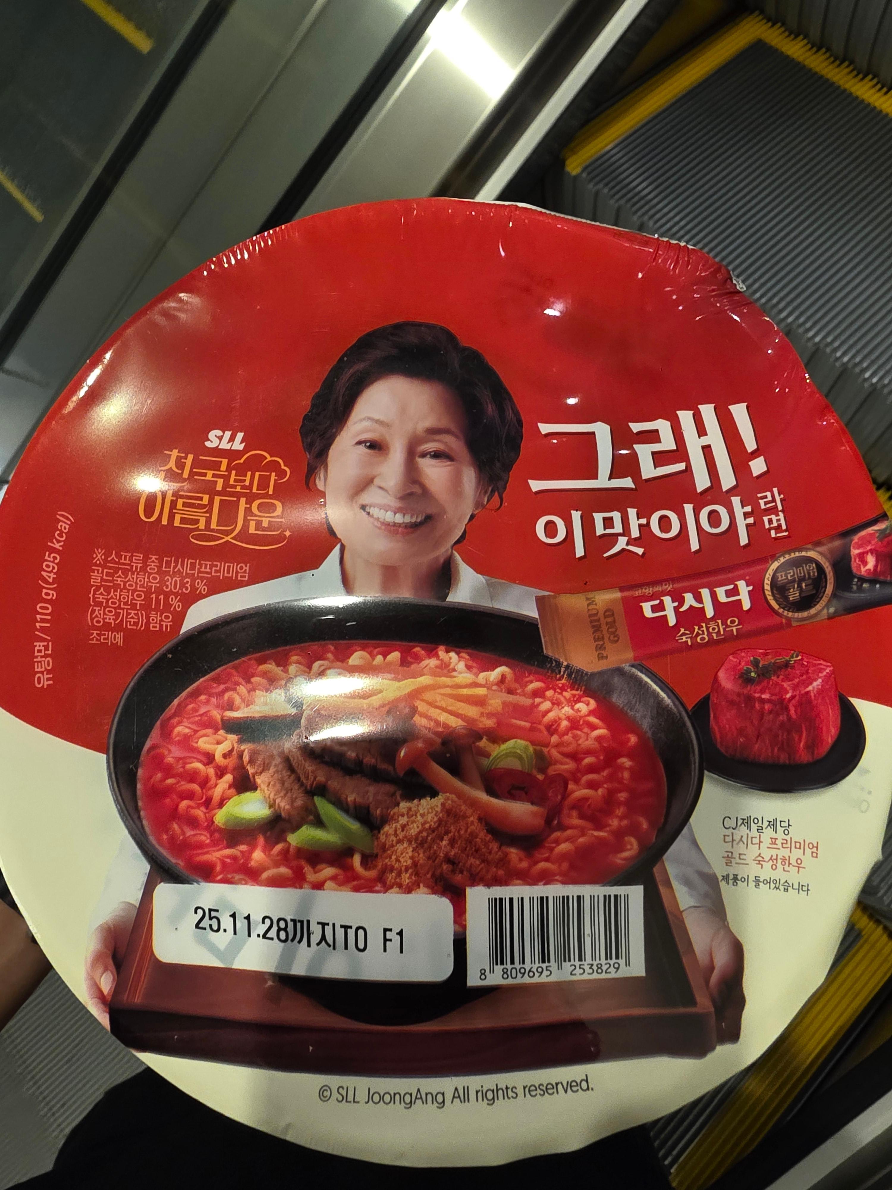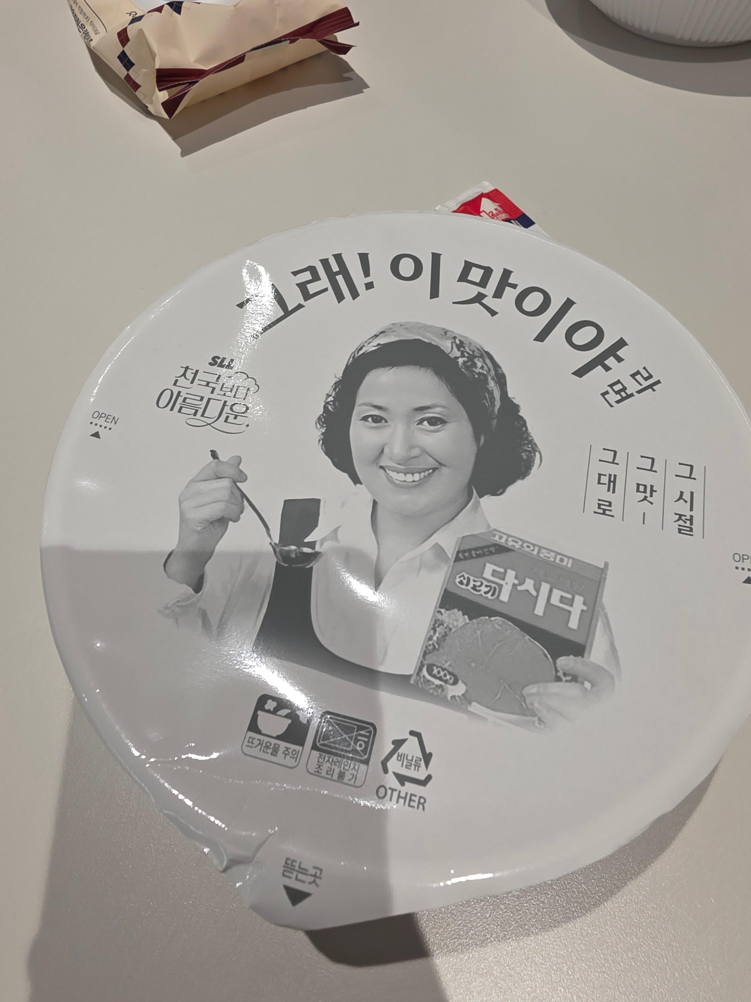 제품을 처음 손에 들었을 때 가장 눈에 띄는 건 배우 김혜자 님의 미소와 “그래! 이맛이야”라는 강렬한 문구였습니다. 라면치고는 굉장히 정갈하고 신뢰감 있는 디자인이 인상 깊었고, ‘다시다 프리미엄 골드 숙성한우’라는 설명은 기대감을 한껏 높여주었습니다.