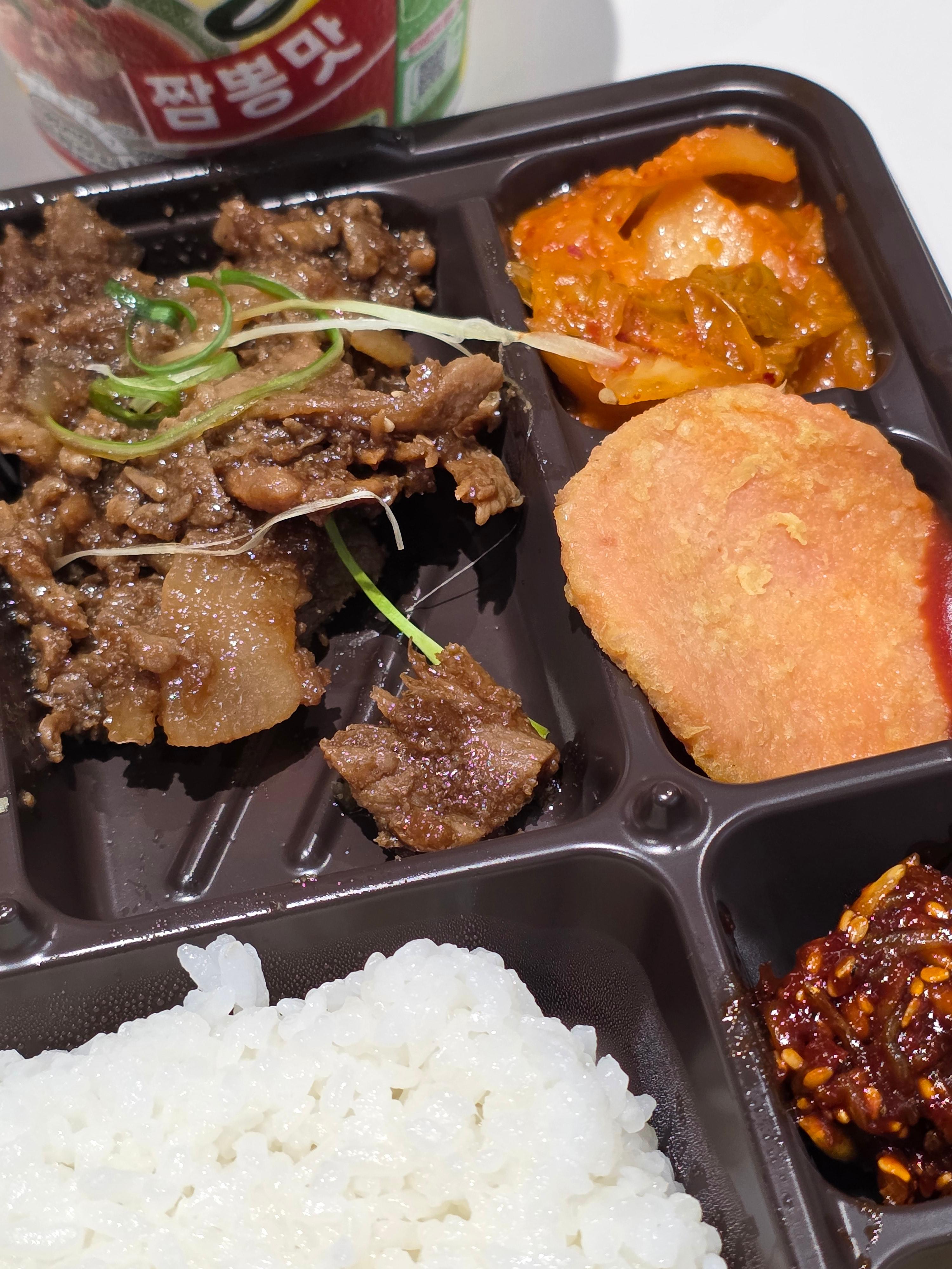 - 김치 – 도시락에 빠질 수 없는 아삭한 김치가 곁들여져 있습니다.