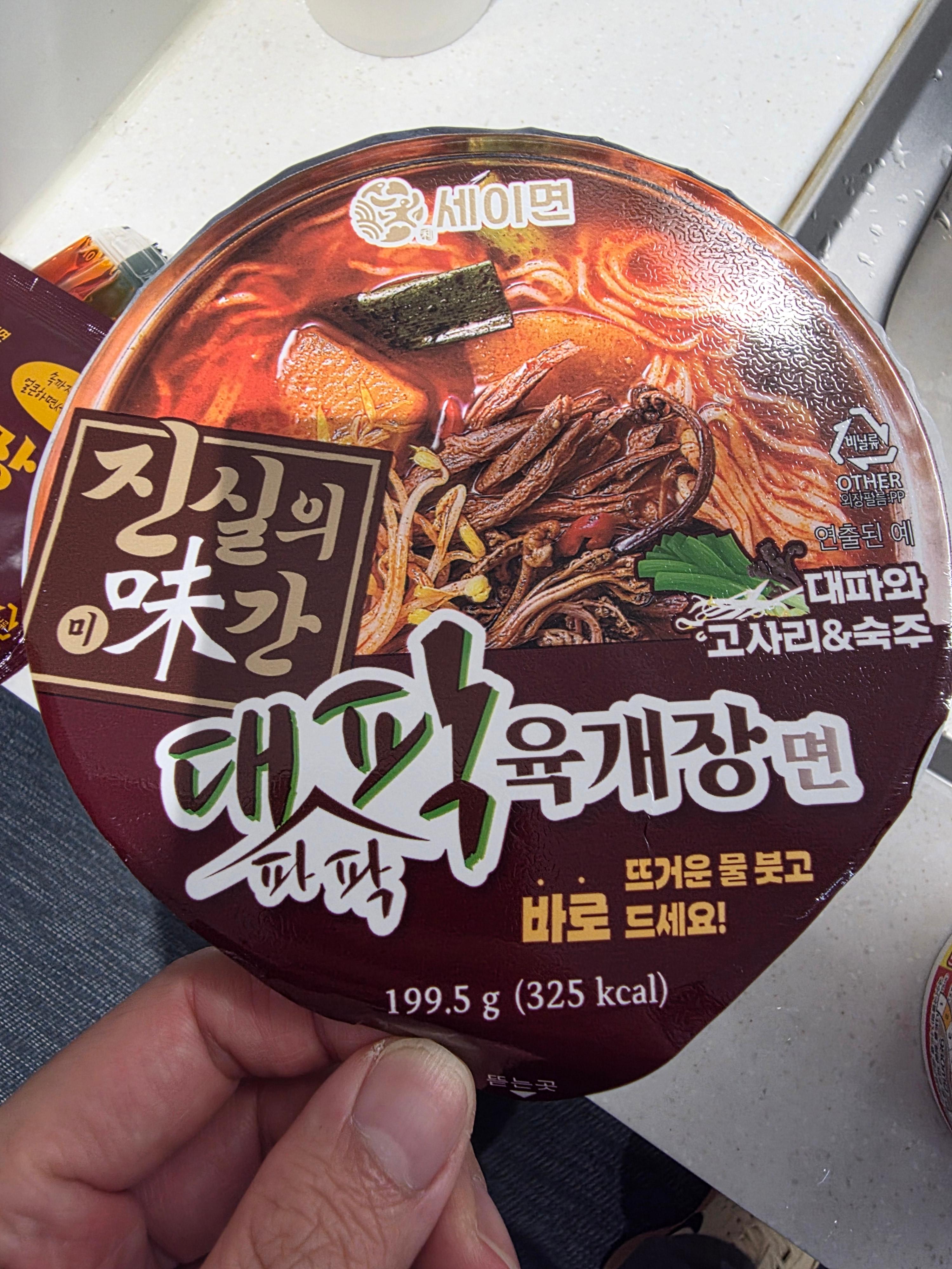 뜨거운 물을 붓고 잠시 기다린 후 먹었는데, 생면도 좋았지만 특히 국물은 얼큰하면서도 깔끔한 맛이 강하고, 육개장의 풍미가 제법 진하게 느껴졌습니다. 특히나 고기 고명과 채소가 잘 어우러져 전체적인 밸런스가 괜찮았어요. 파 향이 국물에 배어들면서 감칠맛이 더해졌고, 면발도 쫄깃한 편이라 컵라면 치고는 완성도가 높은 제품이었습니다.