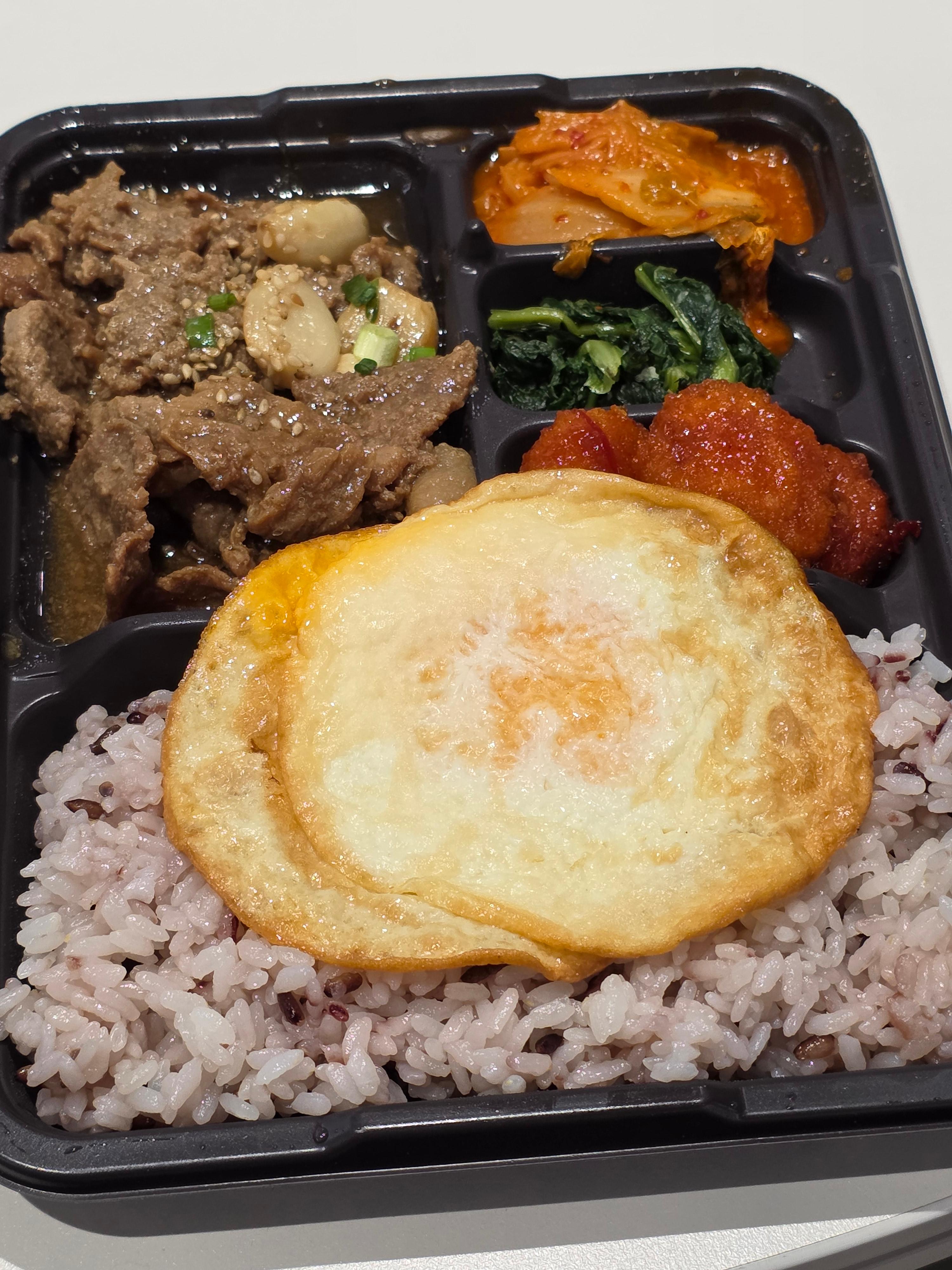 흑미밥은 백미보다 식감이 쫀득하고 고기 양념과 잘 어울립니다. 냉장 도시락이지만 전자레인지에 데우면 밥도 충분히 부드럽게 살아납니다.