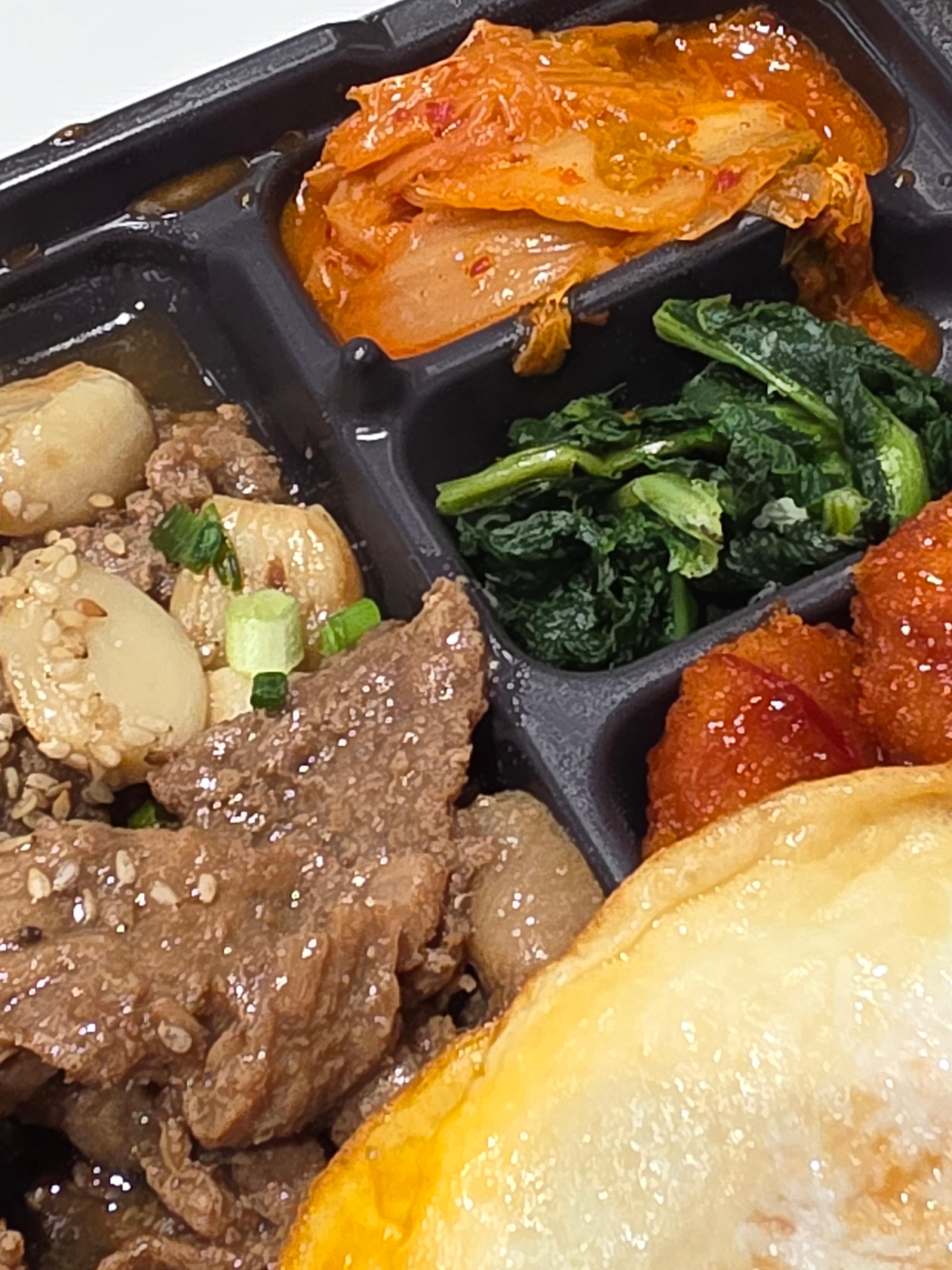 전체적으로 밥 + 반찬 + 메인 고기류로 구성된 전형적인 한식 도시락입니다. 반찬이 기름지지 않고 깔끔한 편이라, 메인 고기와 밸런스를 잘 맞춰줍니다.